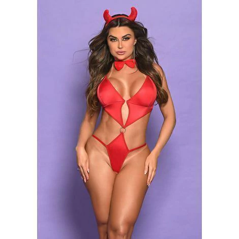 ela é composta por um body com recortes estratégicos e um arco com chifres, criando um visual irresistível e provocante.